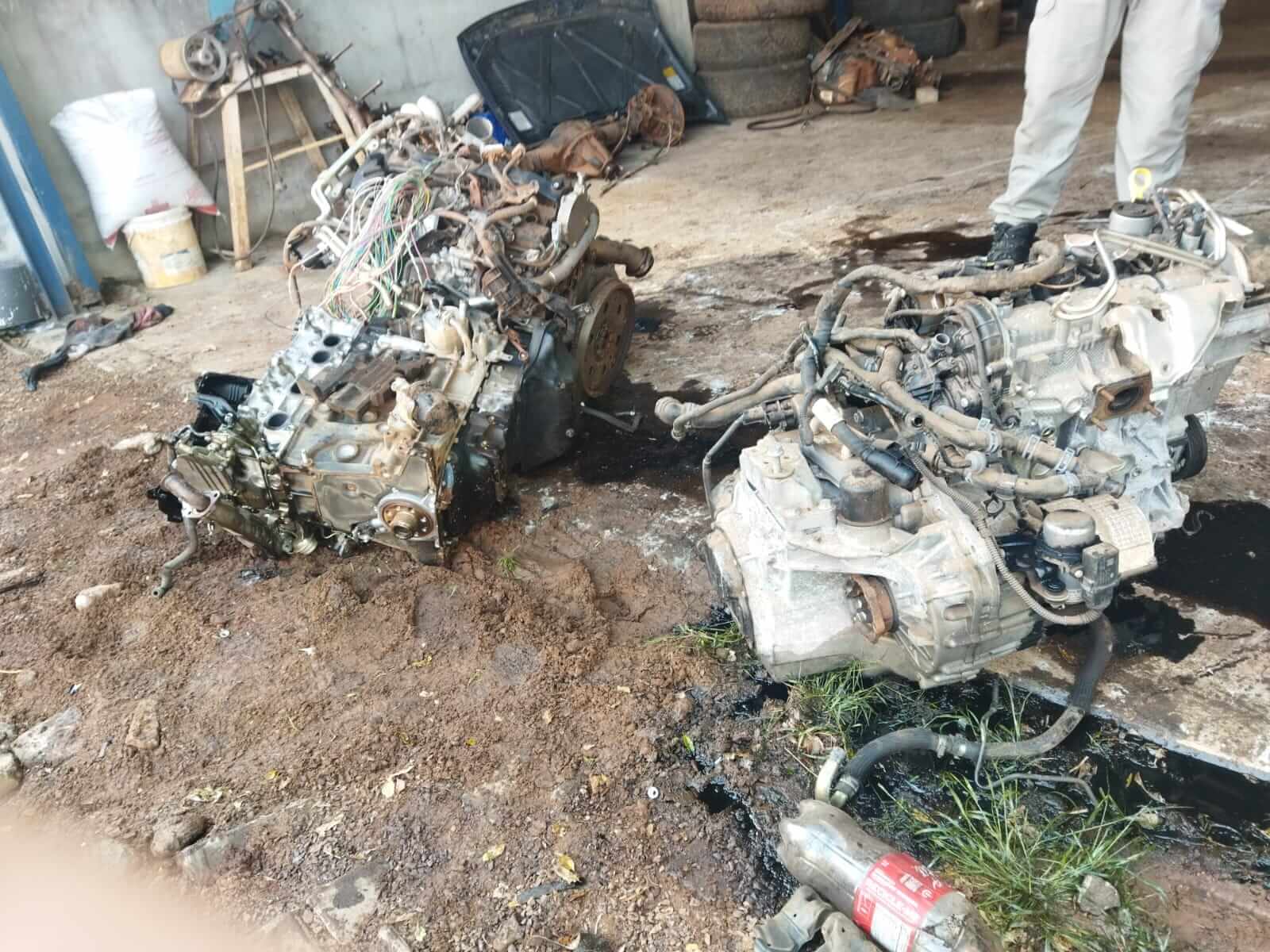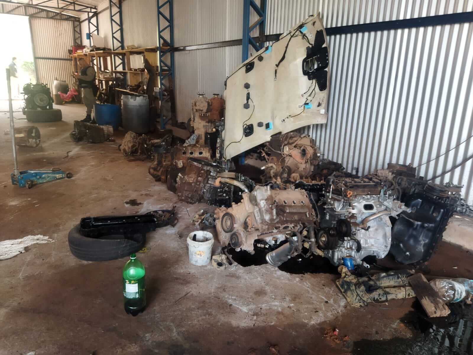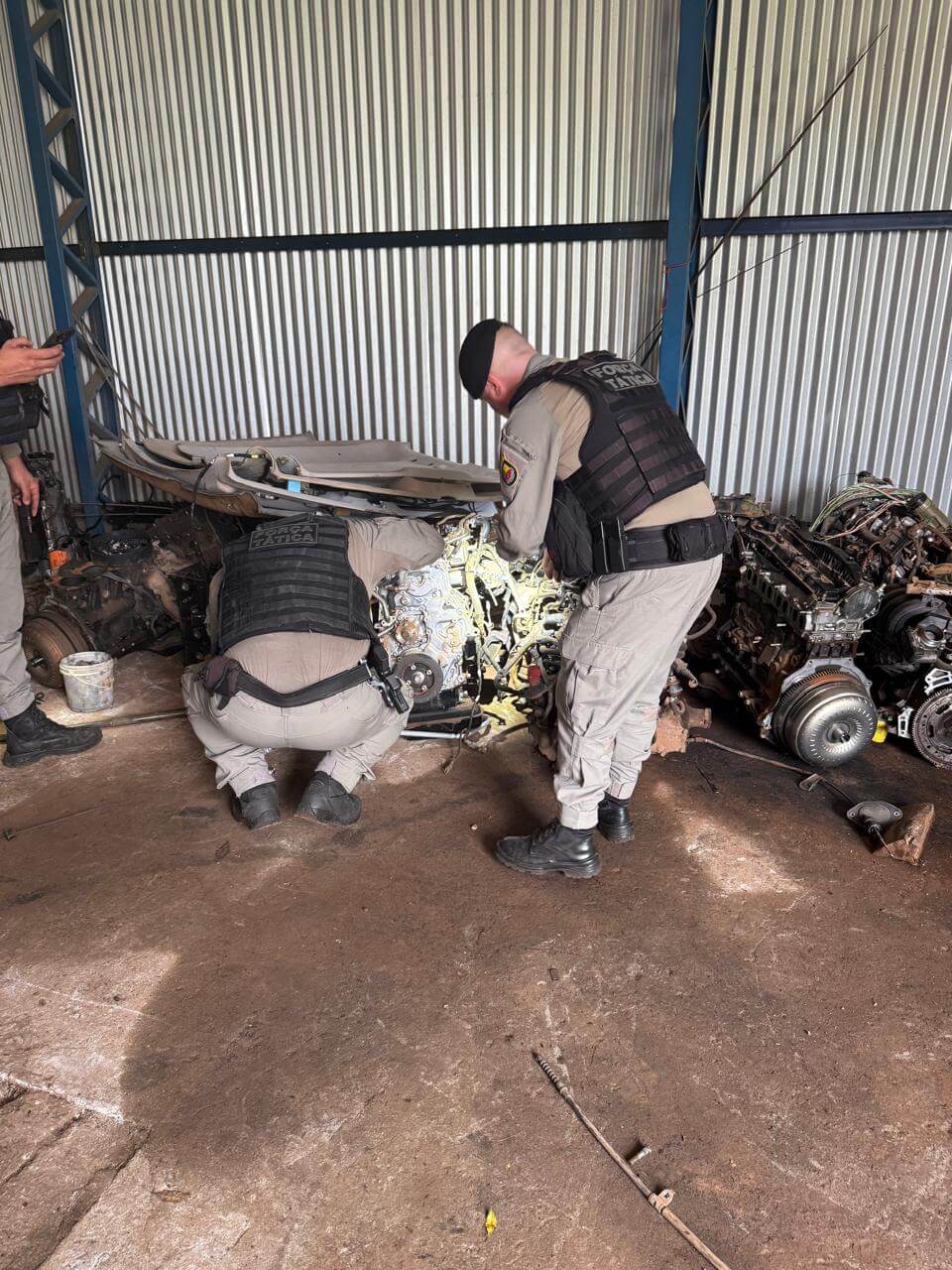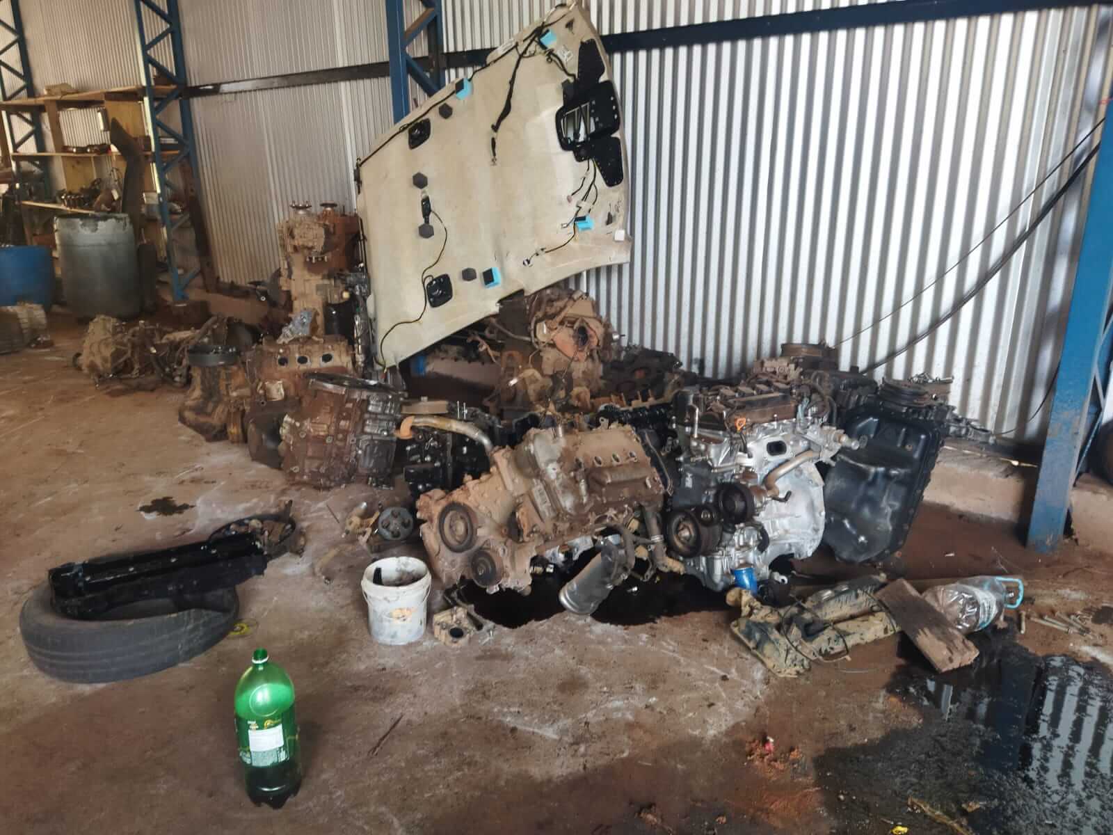 Durante a averiguação, foram localizados três veículos em situação de furto/roubo, todos parcialmente desmontados: Nissan Frontier, VW Amarok, Iveco Daily.